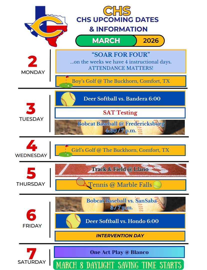 Five-minute Friday Comfort High School February 27, 2026 Congratulations Bobcats! Congratulations Deer! 2026 Cheer Banquet Comfort ISD Website